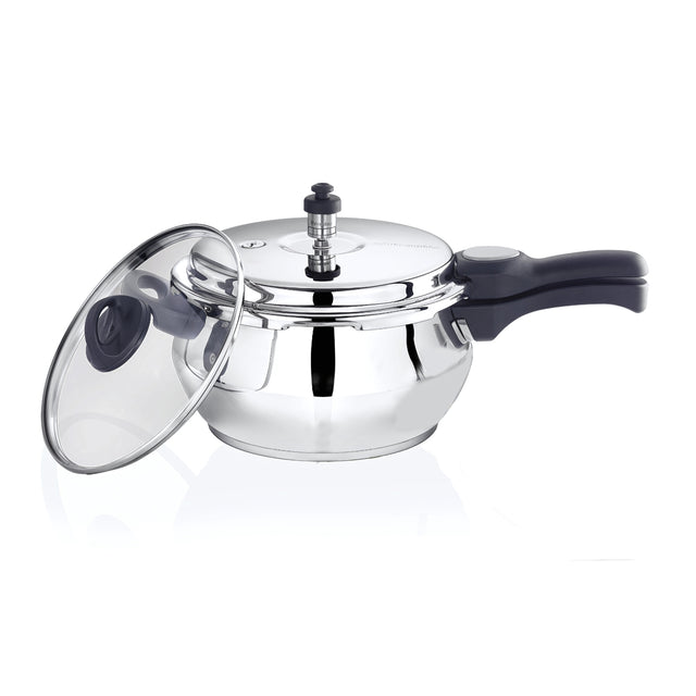 - Outer lid, Unique gasket release system for safety, Strong heat-resistant Bakelite handle, Safety valve, Handi shape, Transparent glass lid